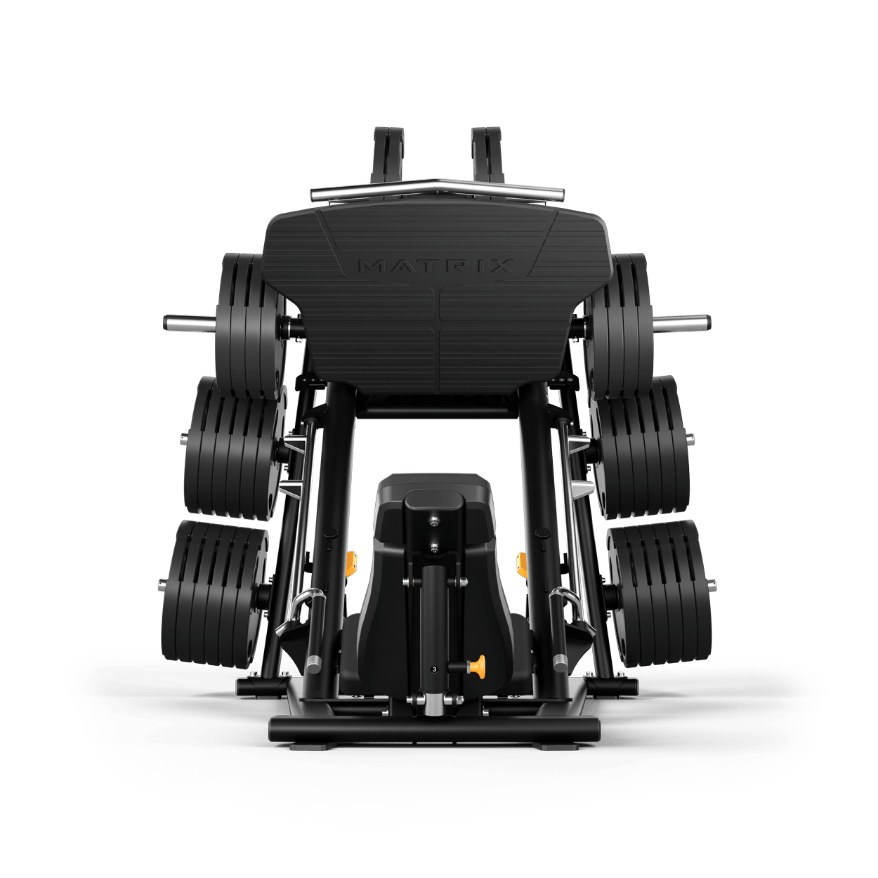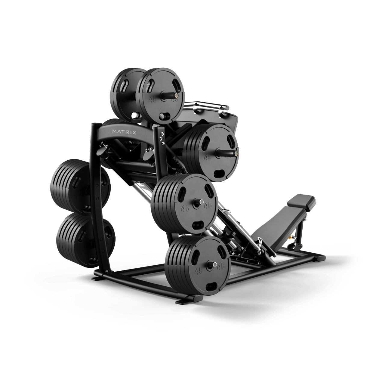 Our Magnum 45-Degree Leg Press targets the quadriceps and glutes with efficient movements. An adjustable bottom stop provides long or short ranges of motion for users of all heights, and an adjustable back pad enhances comfort while optimizing the angle of the hips and accommodating a variety of body types. It includes an easy-to-use racking mechanism, platform handles for easier entry and exit and linear bearings for a smoother feel. Four integrated weight horns hold multiple plate sizes.